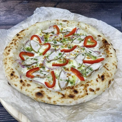 Пицца с соусом бешамель, курицей, болгарским перцем и зеленым маслом