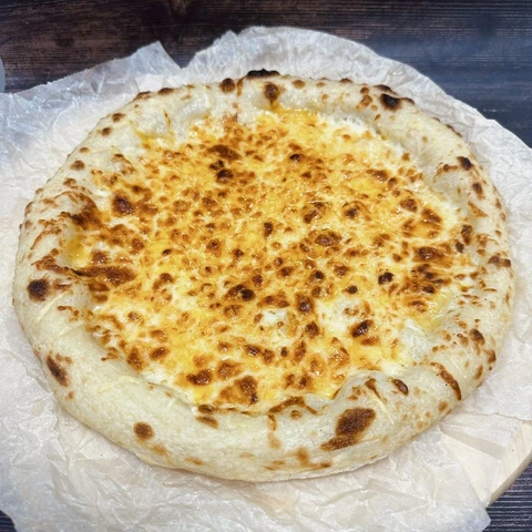 Пицца на фирменном бездрожжевом тесте на основе соуса бешамель с 3 видами сыра: моцарелла, пармезан, Чеддер.