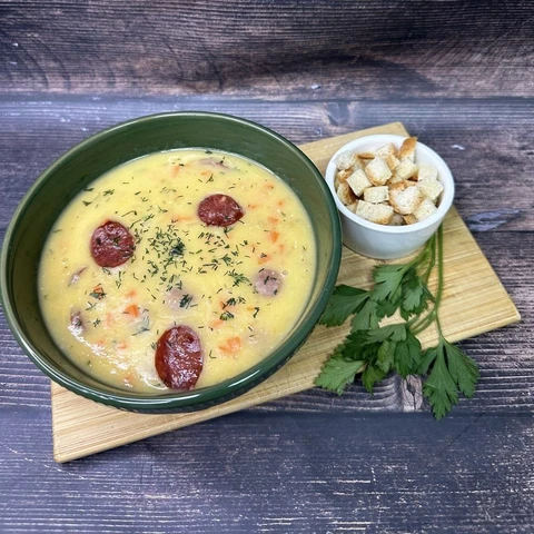 Крем суп с копчеными колбасками
