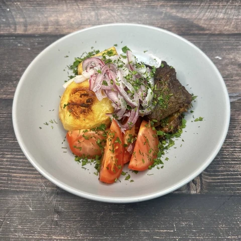 Нежное, томленое мясо, подается с золотистым картофелем и маринованным луком