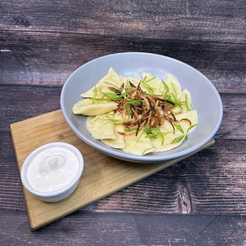 Ароматные вареники с ярким вкусом, подаются со сметаной и луком фри