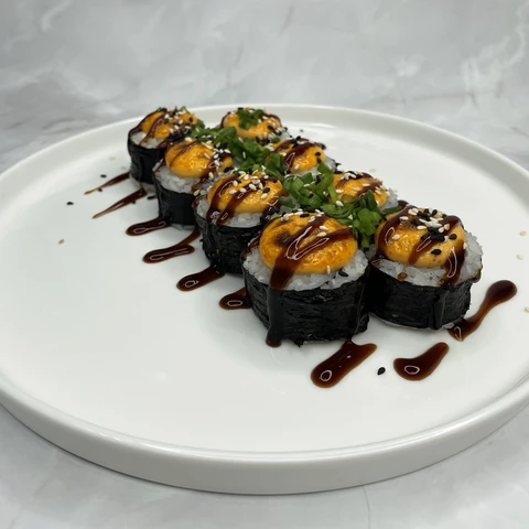 Рис, креветка темпура, креметта, спайси соус, унаги соус, зеленый лук